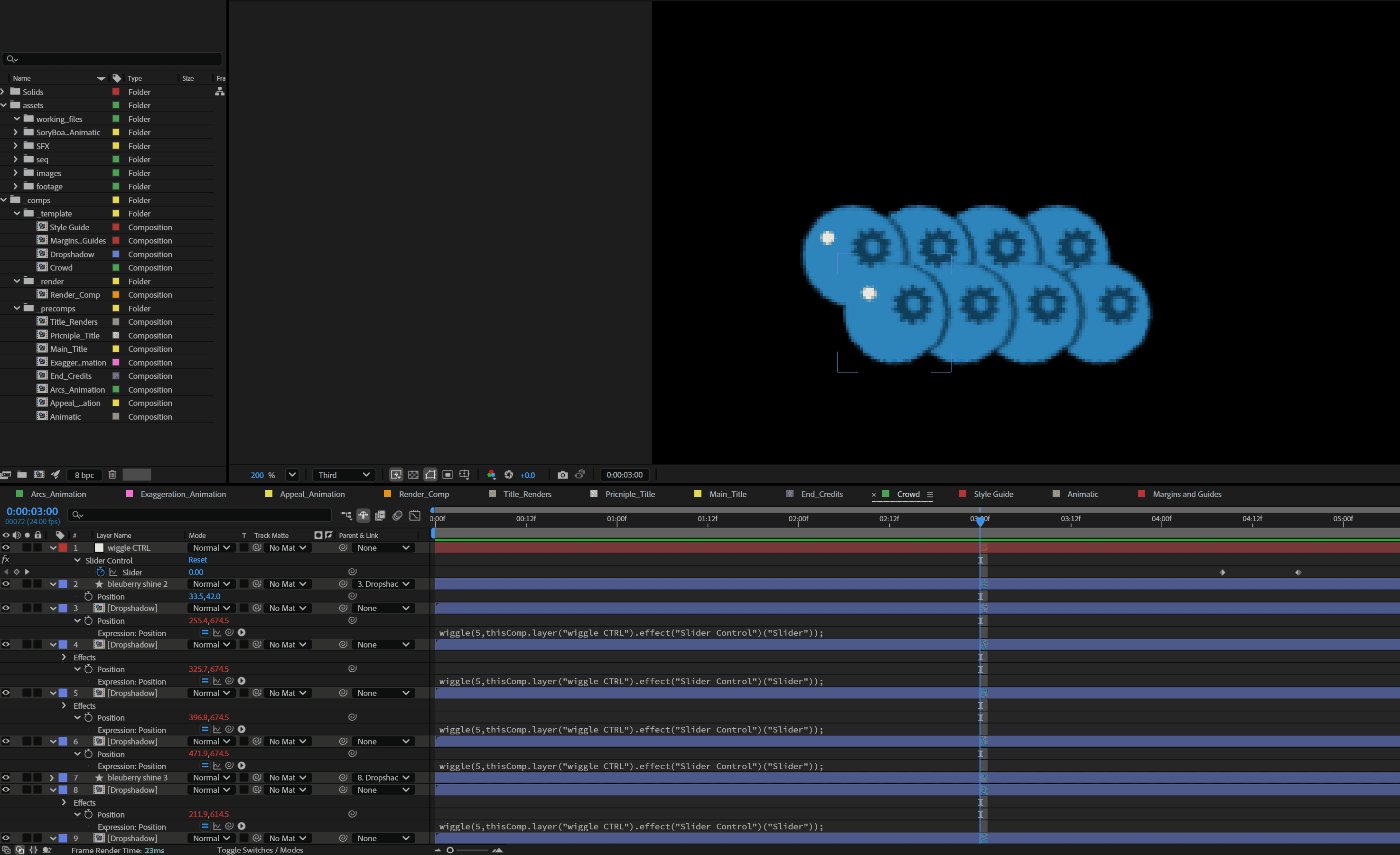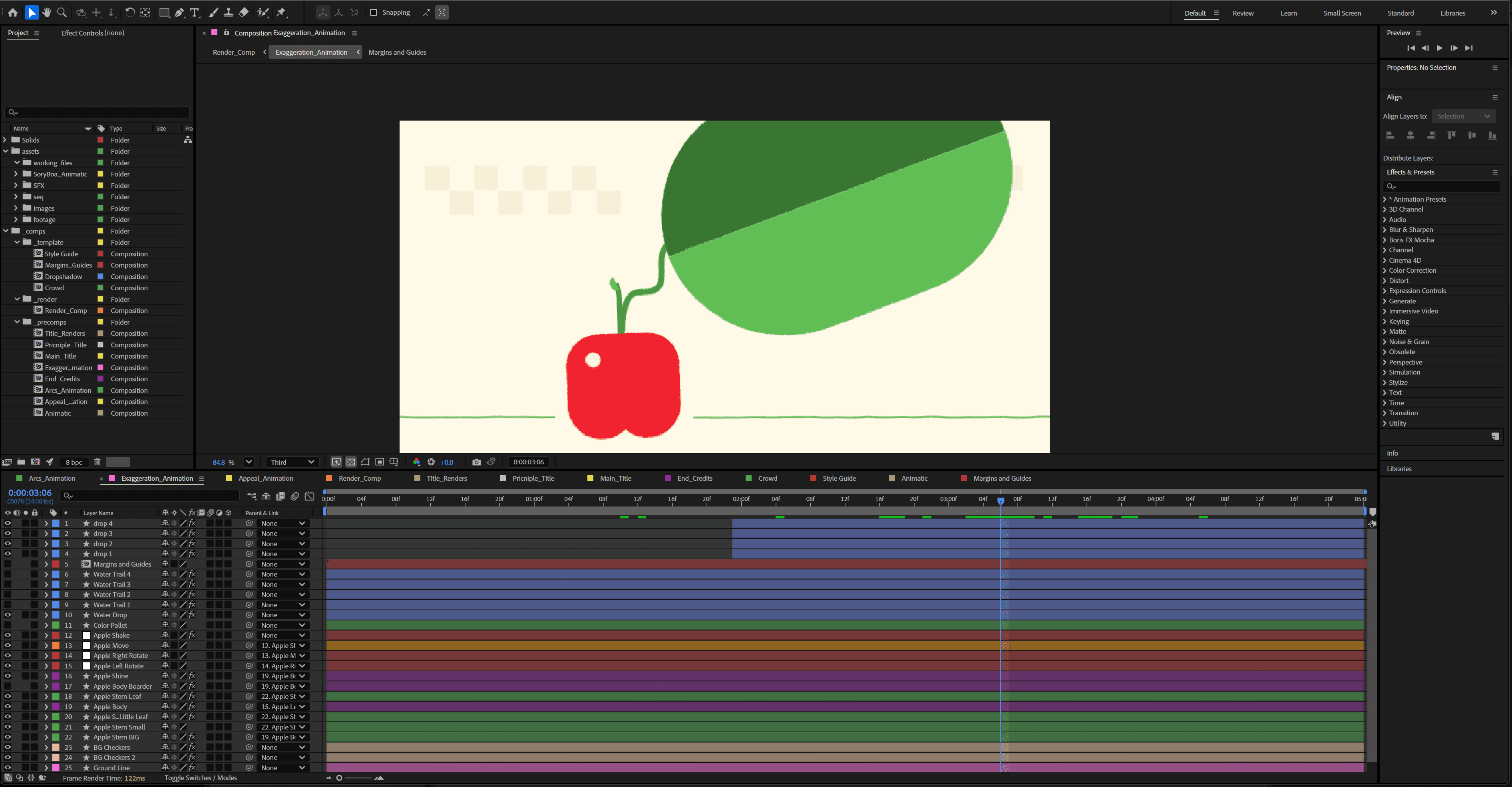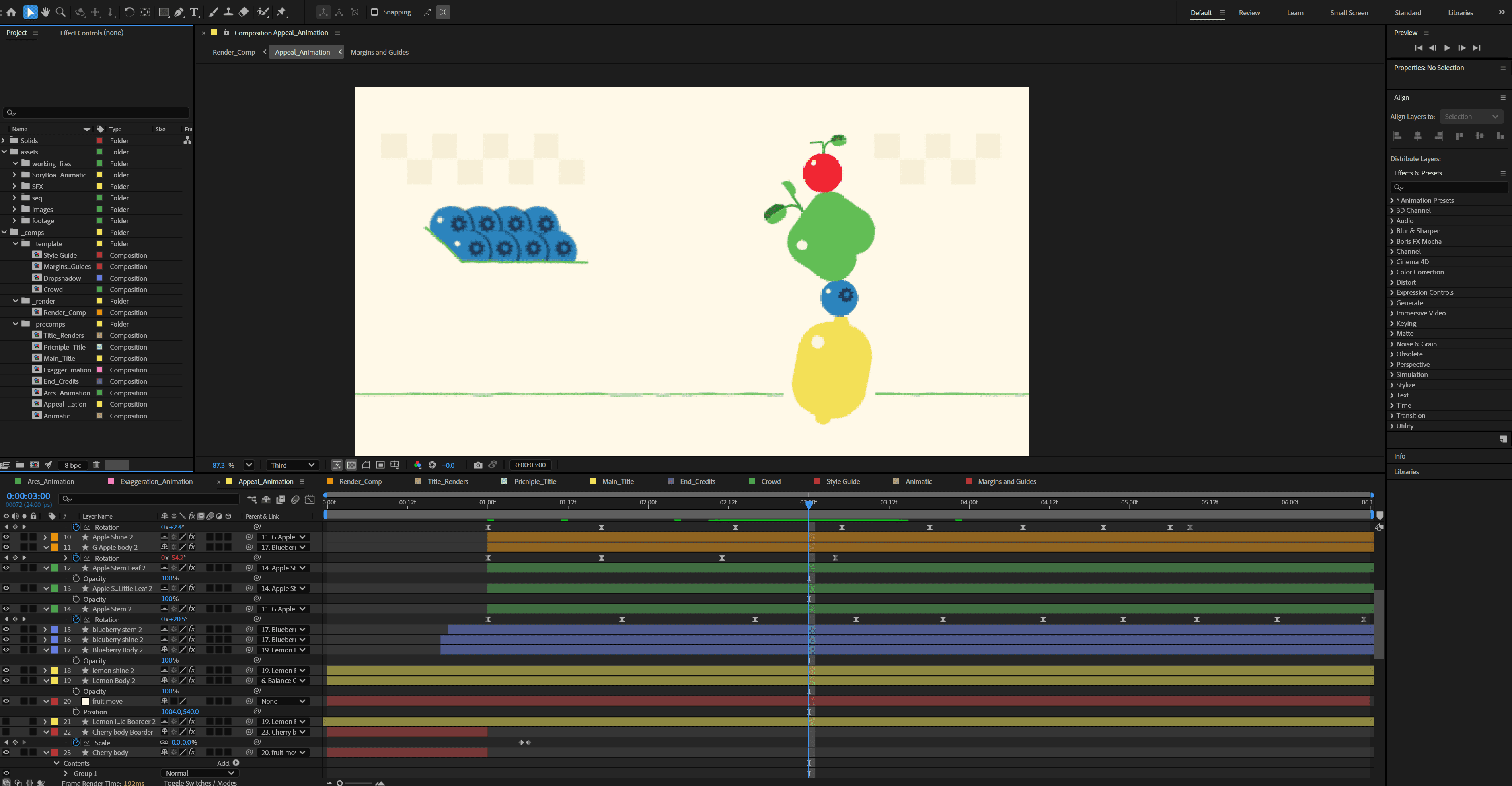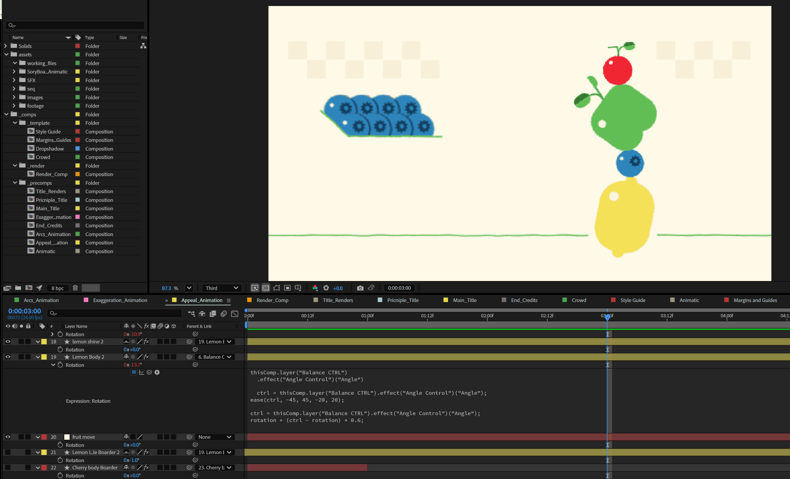 Once the design was polished and the animation was clear, we started animating in After Effects. I built my designs within After Effects so they were already ready for animation. Some animation was just simple arc ball bounces and exaggerated object movement, but my greatest difficulty was nailing down the balancing fruit in principle appeal! To make it easier for myself, I scripted a rig to control overlap and follow-through with an opposite line of code. I then meticulously went through each sway to polish the movement back and forth.