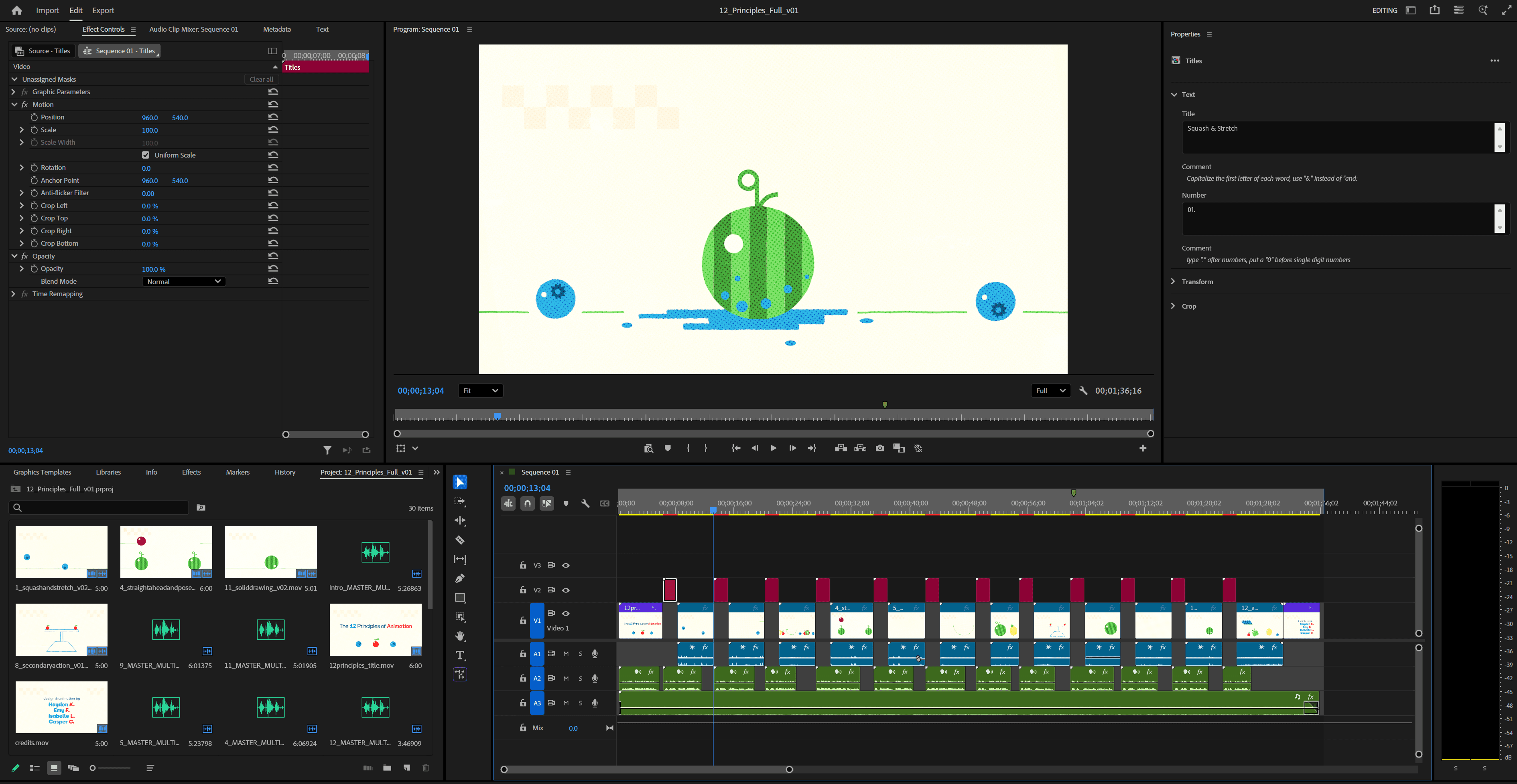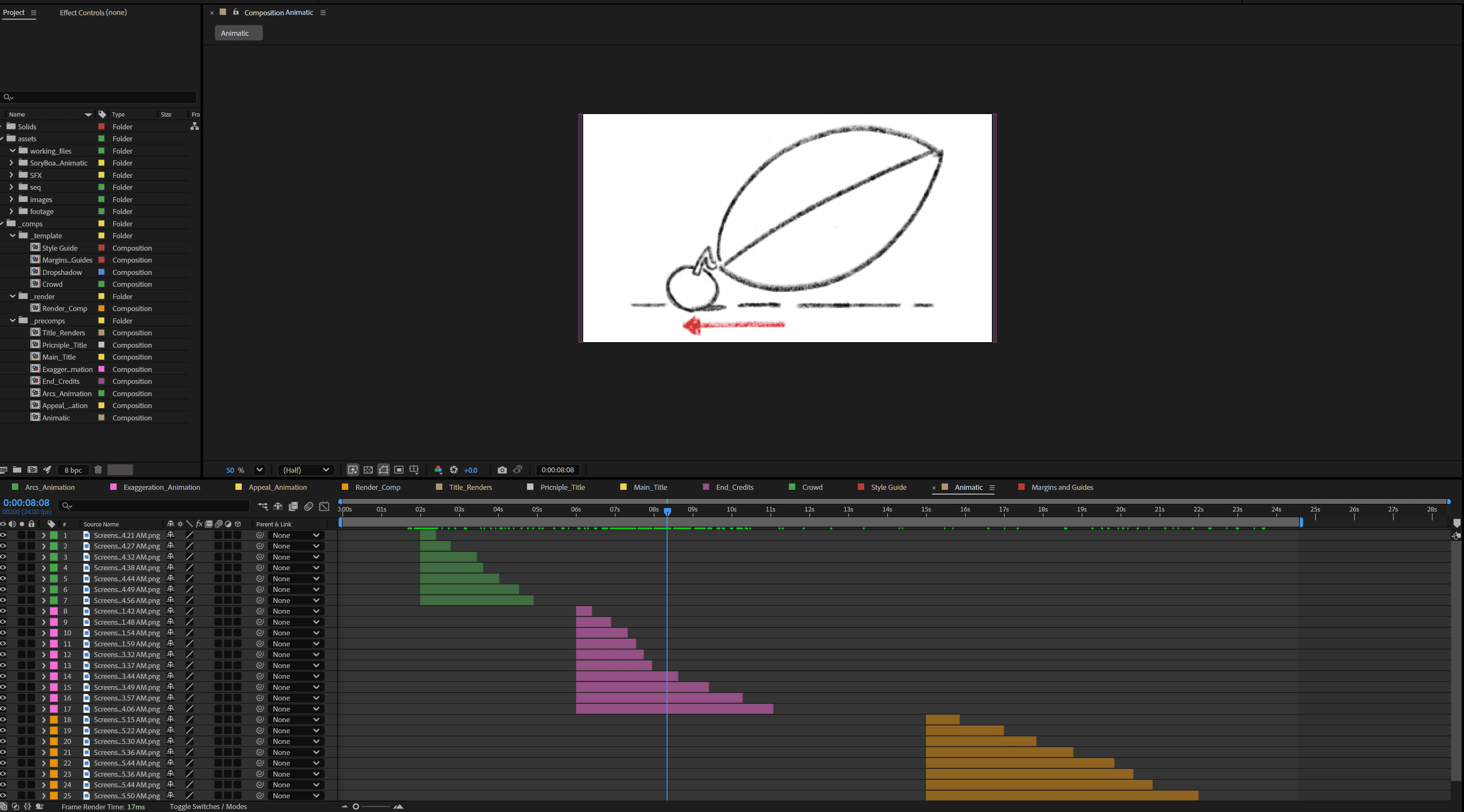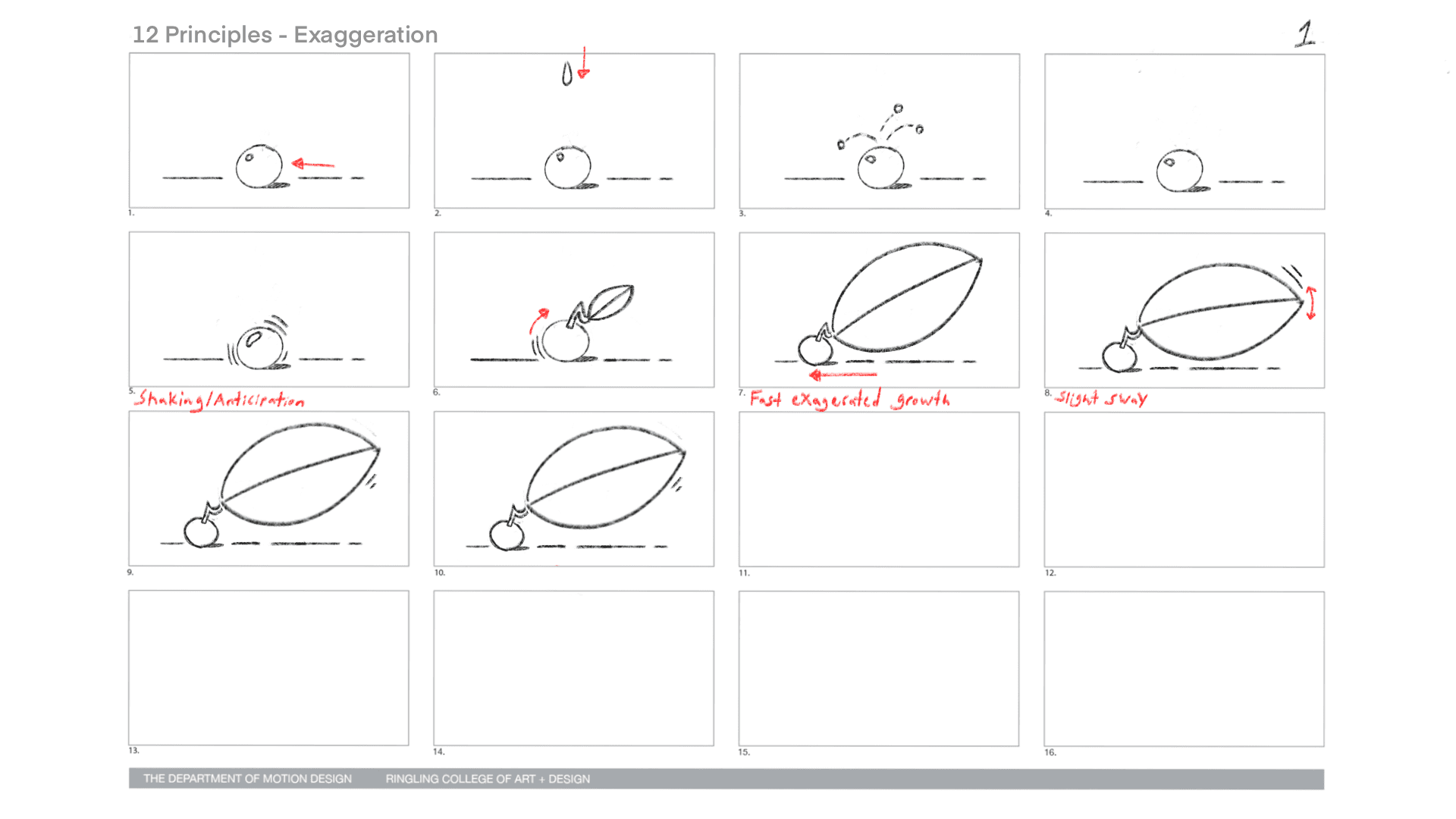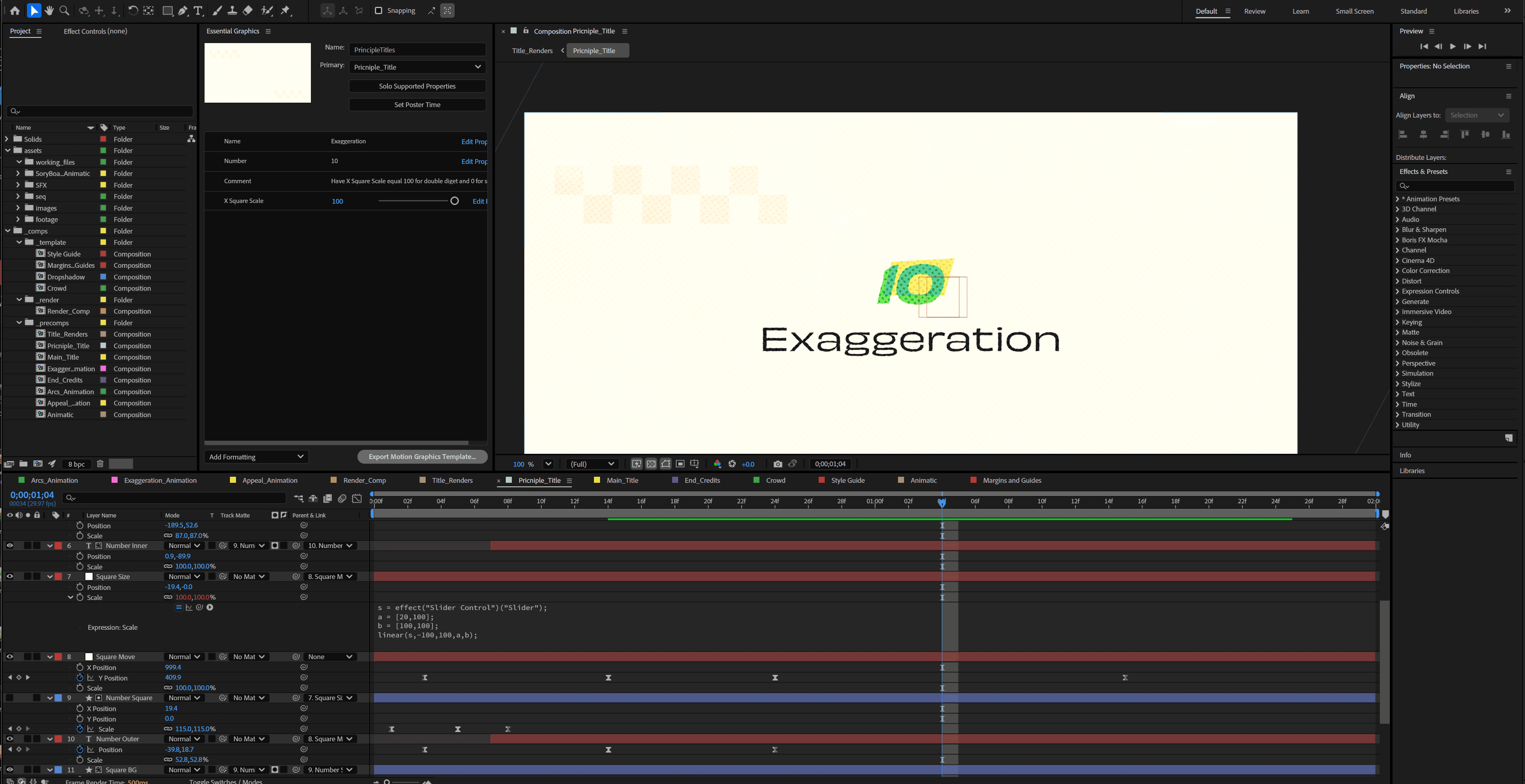 I chose to take on the animation for Exaggeration, Arcs, and Appeal because of some goofy ideas I had. Along with our assigned principles, we also had to create different versions of text displays and how they would animate (which would soon be scripted and turned into motion templates for editing). I then started pitching designs to my team, and we ultimately chose mine as the style direction.