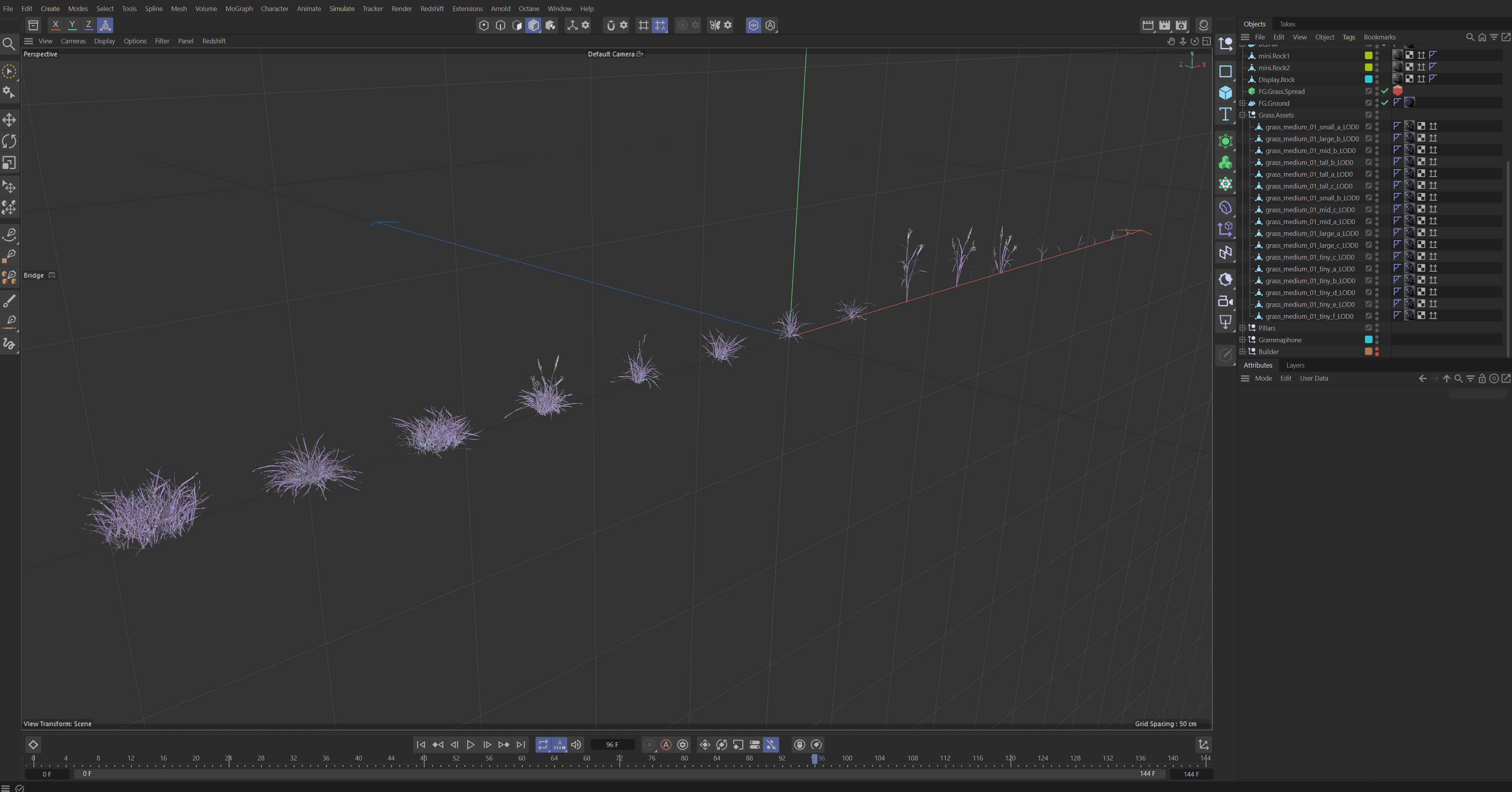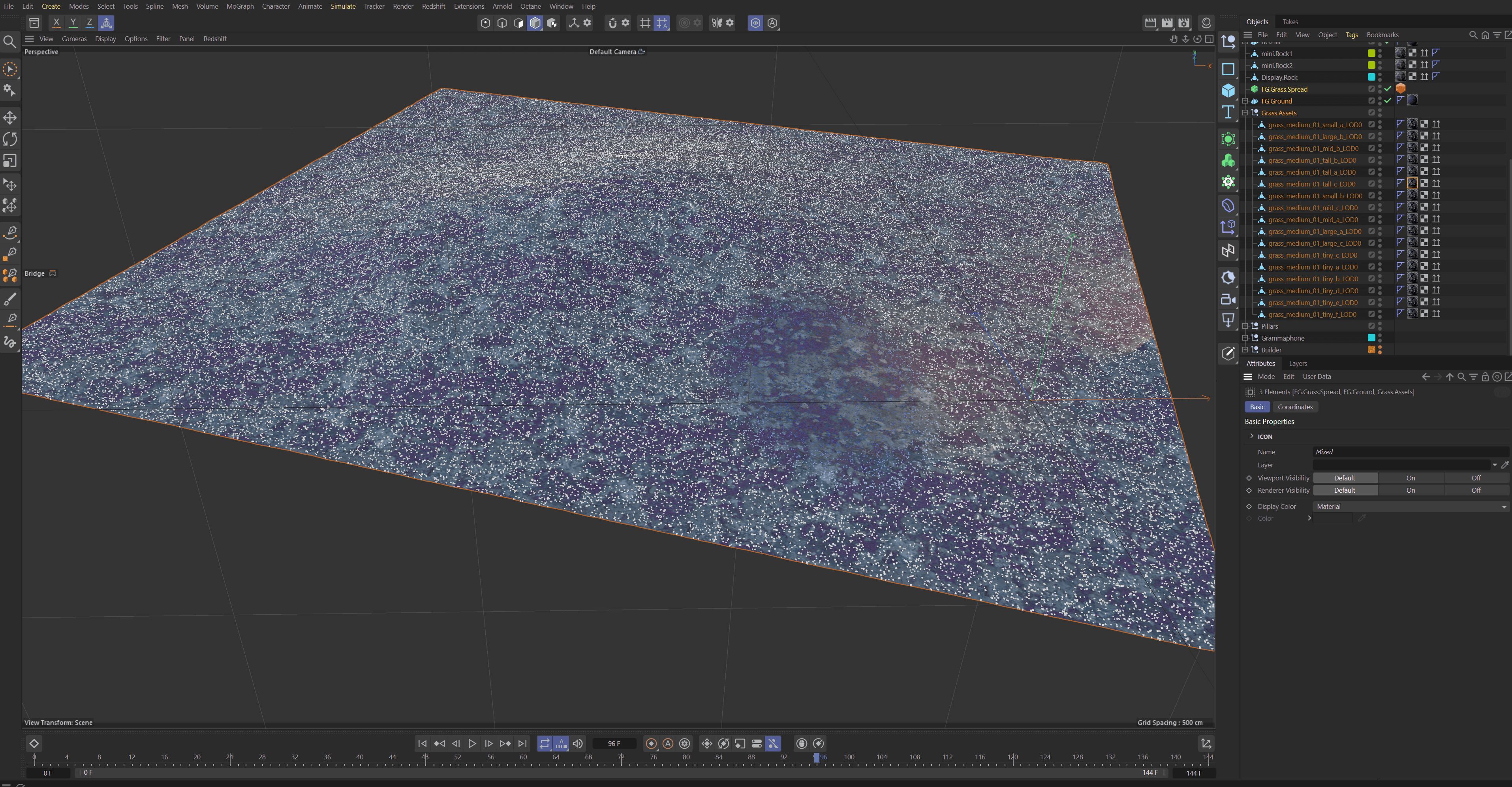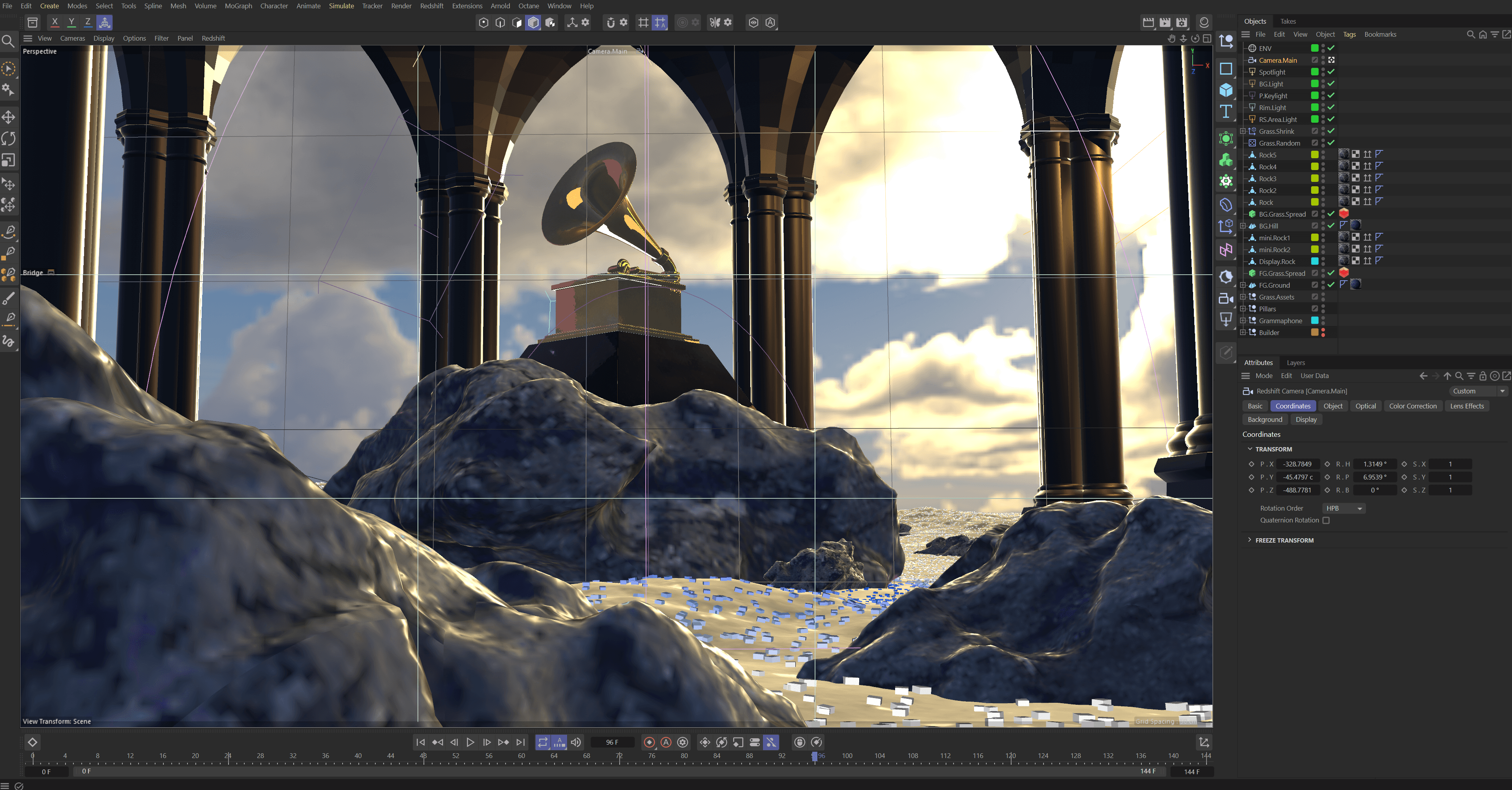 Once I had the model, I started creating a scene to give the feel of premium music, which also felt natural and grand. I landed on a field of lavender grass and alien-like rocks, with the center a grandiose ring of pillars, symbolizing that the Grammys are where the pillars of the music industry unite.