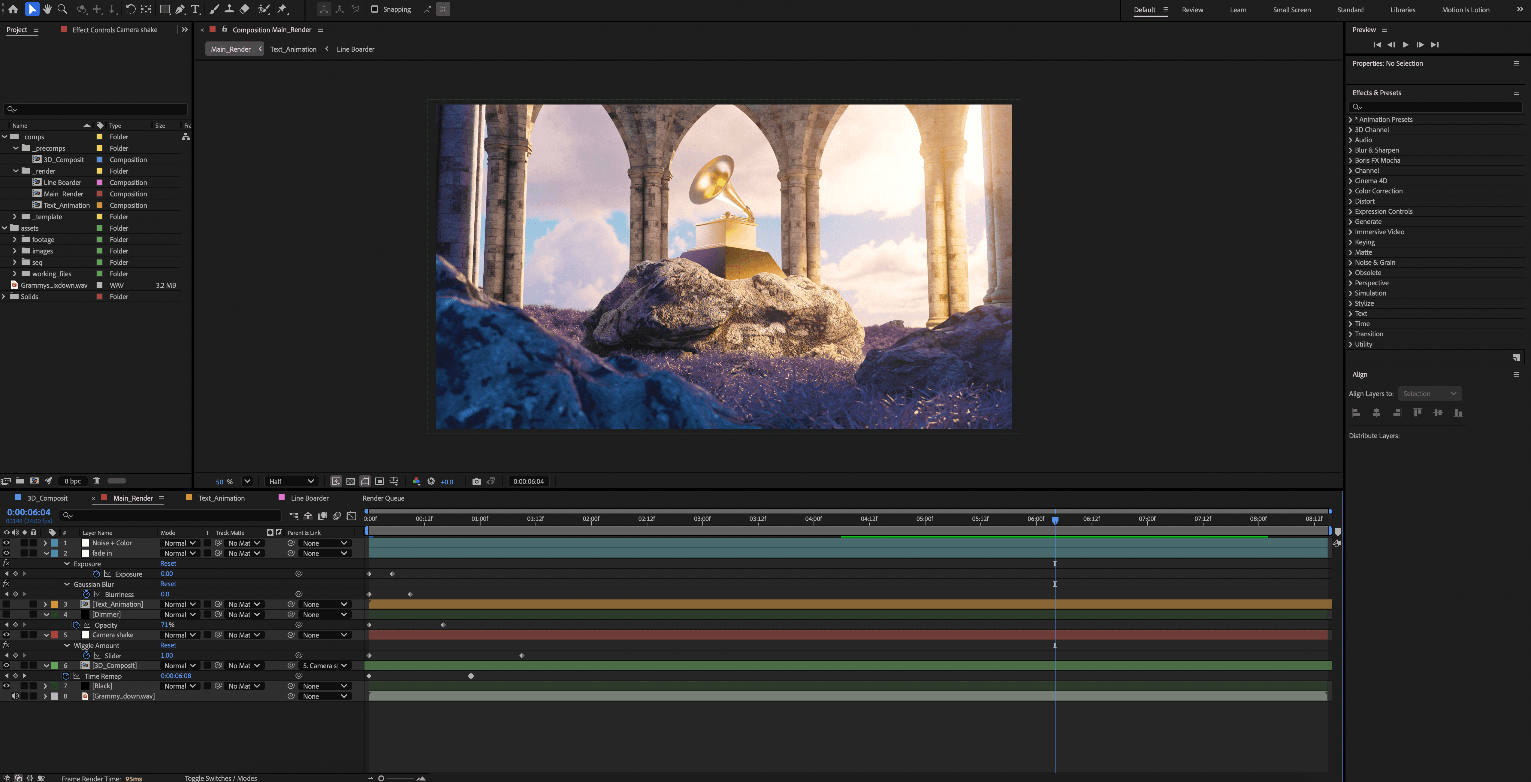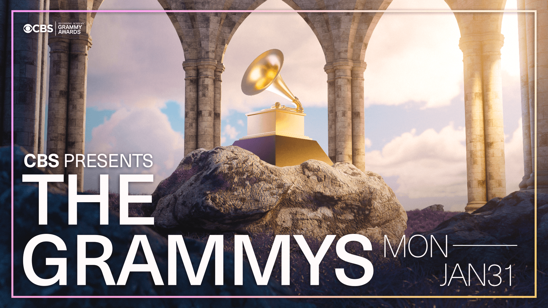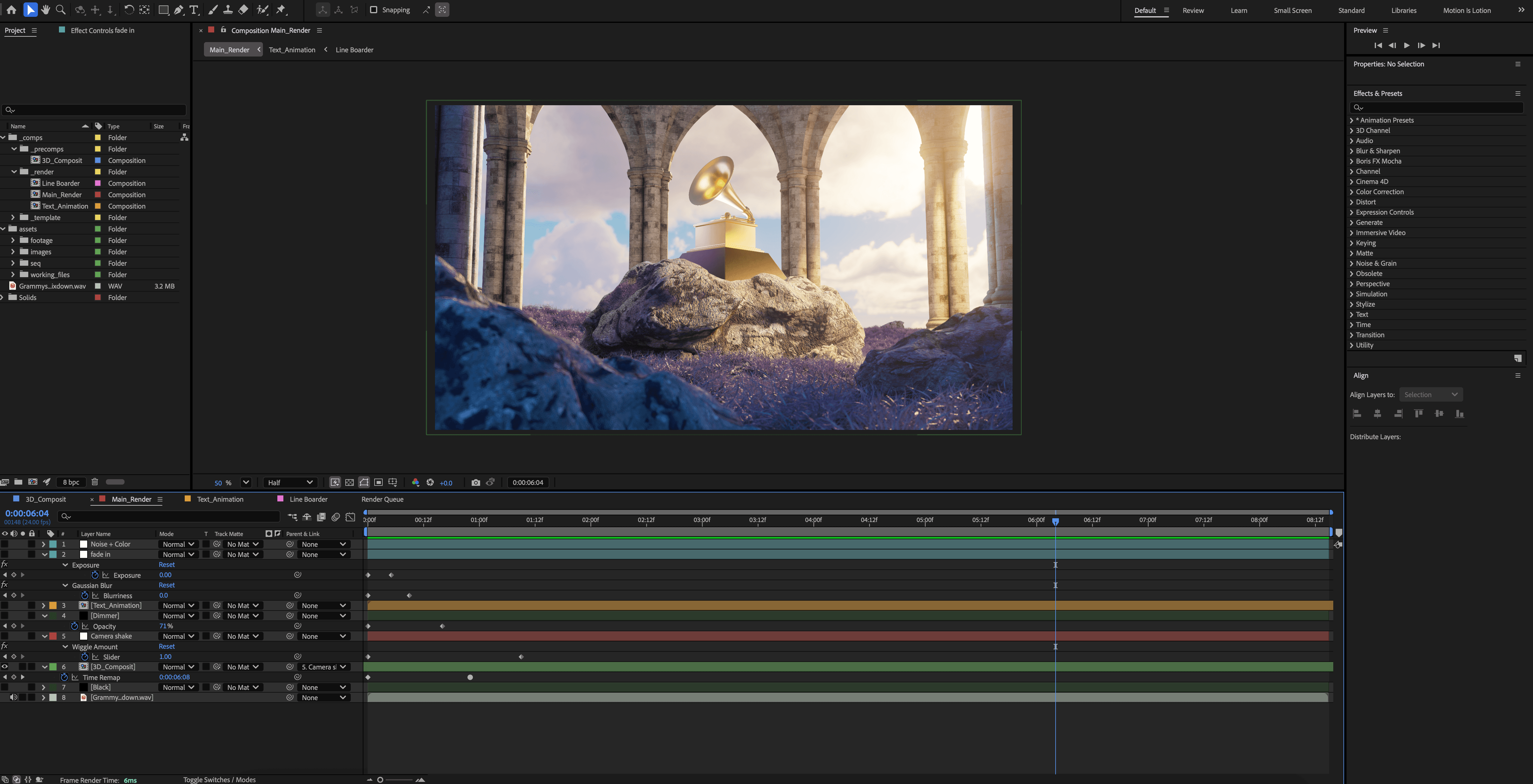 Once I had the model, I started creating a scene to give the feel of premium music, which also felt natural and grand. I landed on a field of lavender grass and alien-like rocks, with the center a grandiose ring of pillars, symbolizing that the Grammys are where the pillars of the music industry unite.