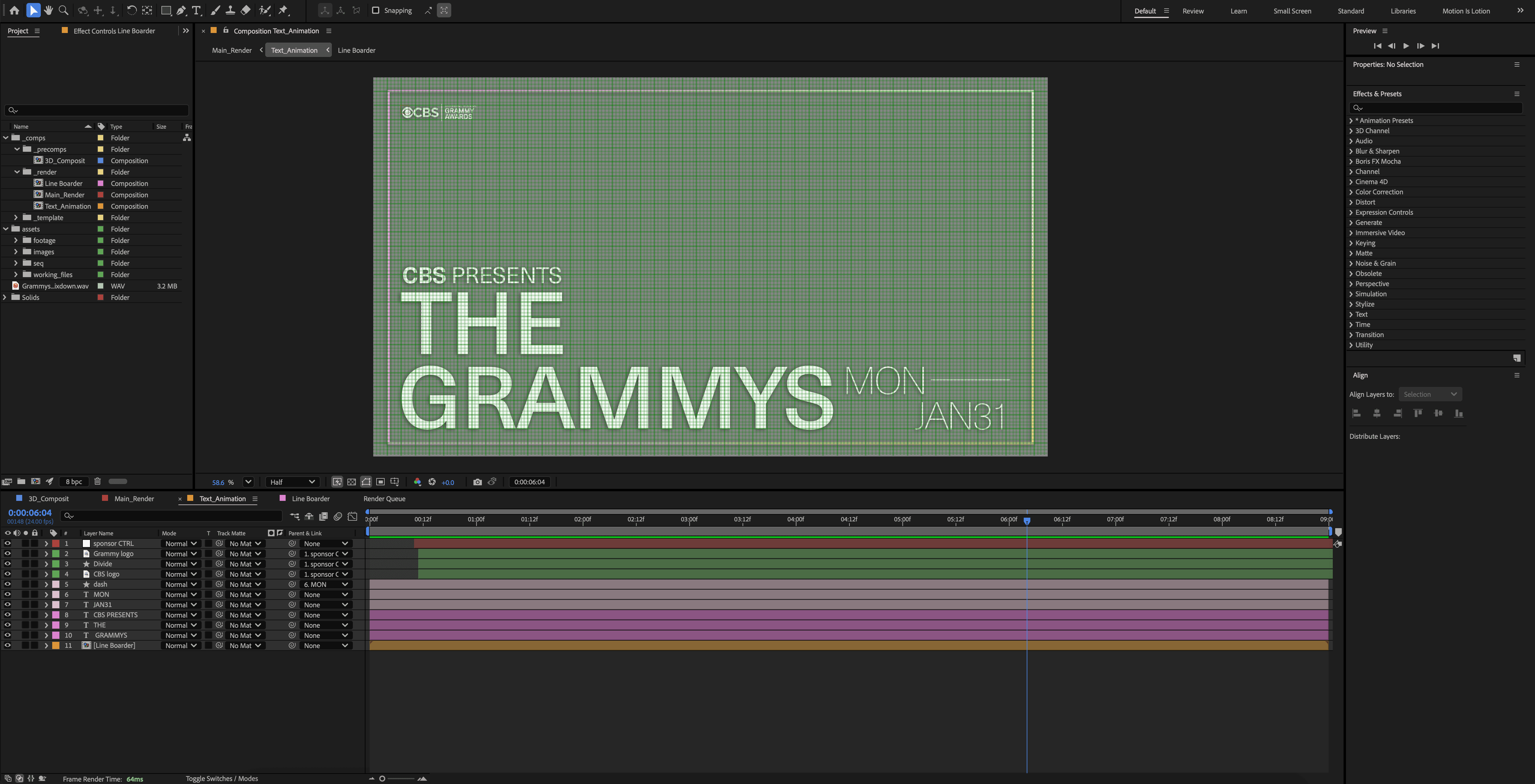 The modeling and scene building were done, and an animated camera movement was rendered out to send to After Effects for the visual information that was crucial for letting the viewers know where and when. I also took the time to color-correct and sharpen the image to give the animation's lighting a more surreal look.