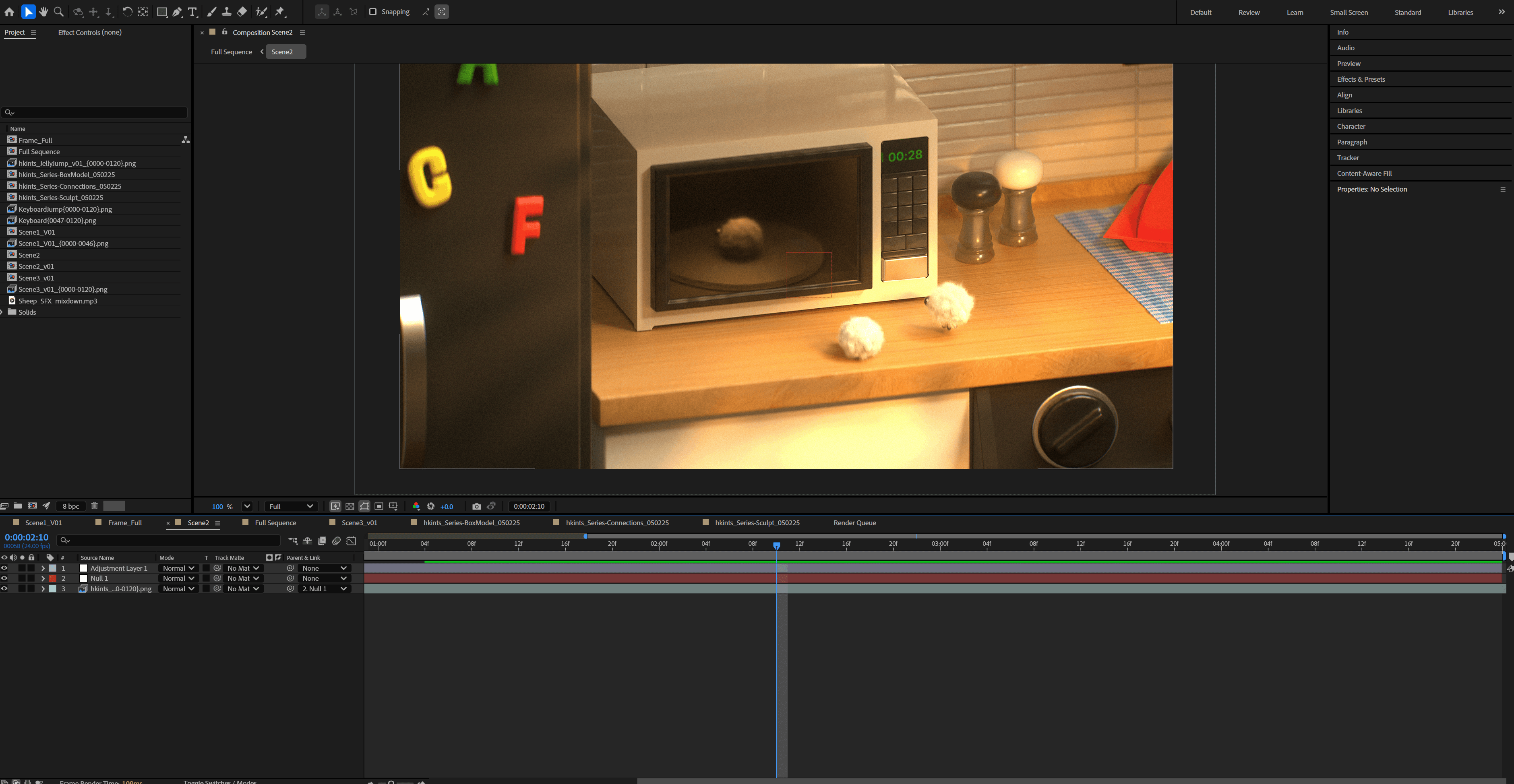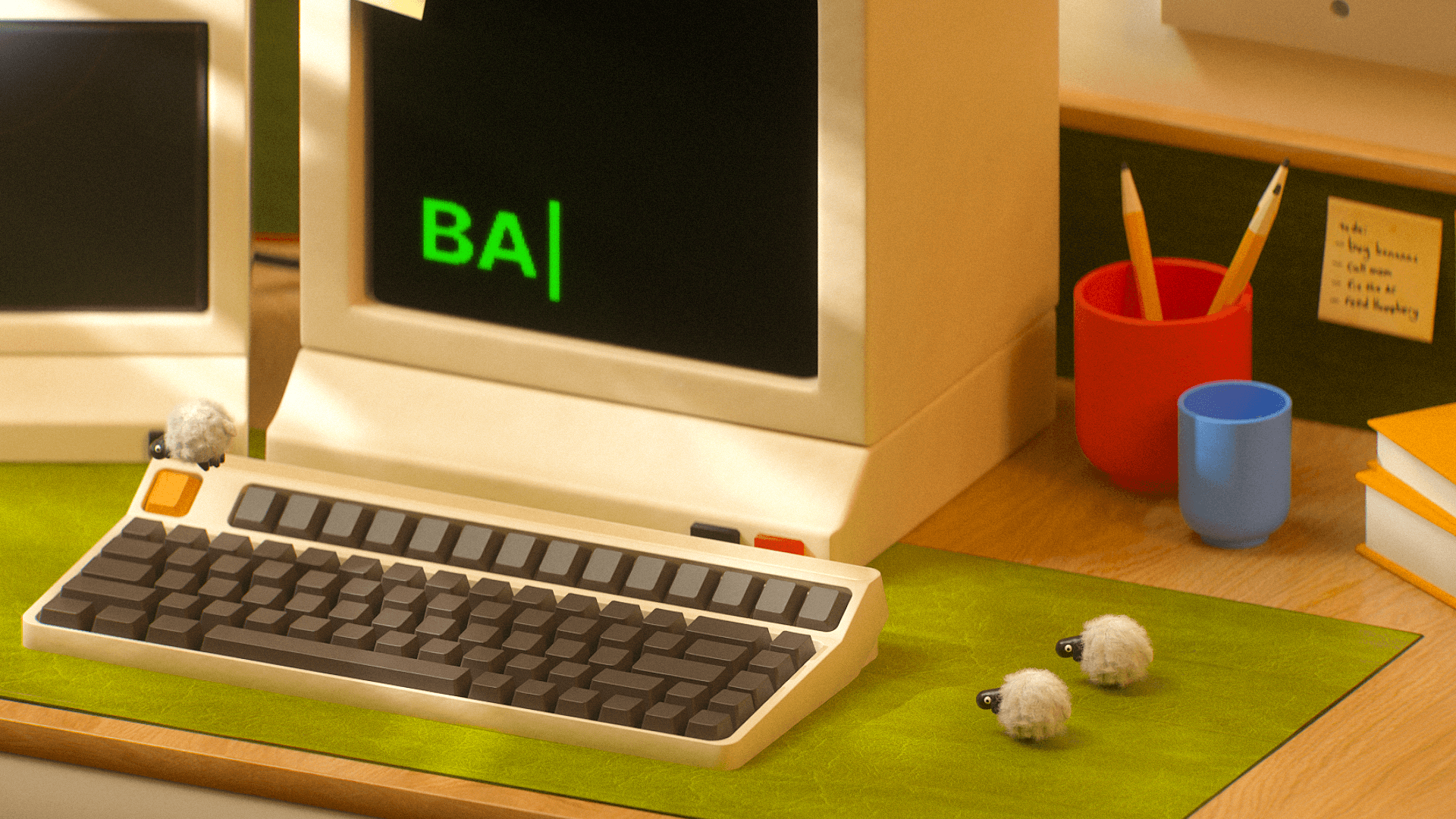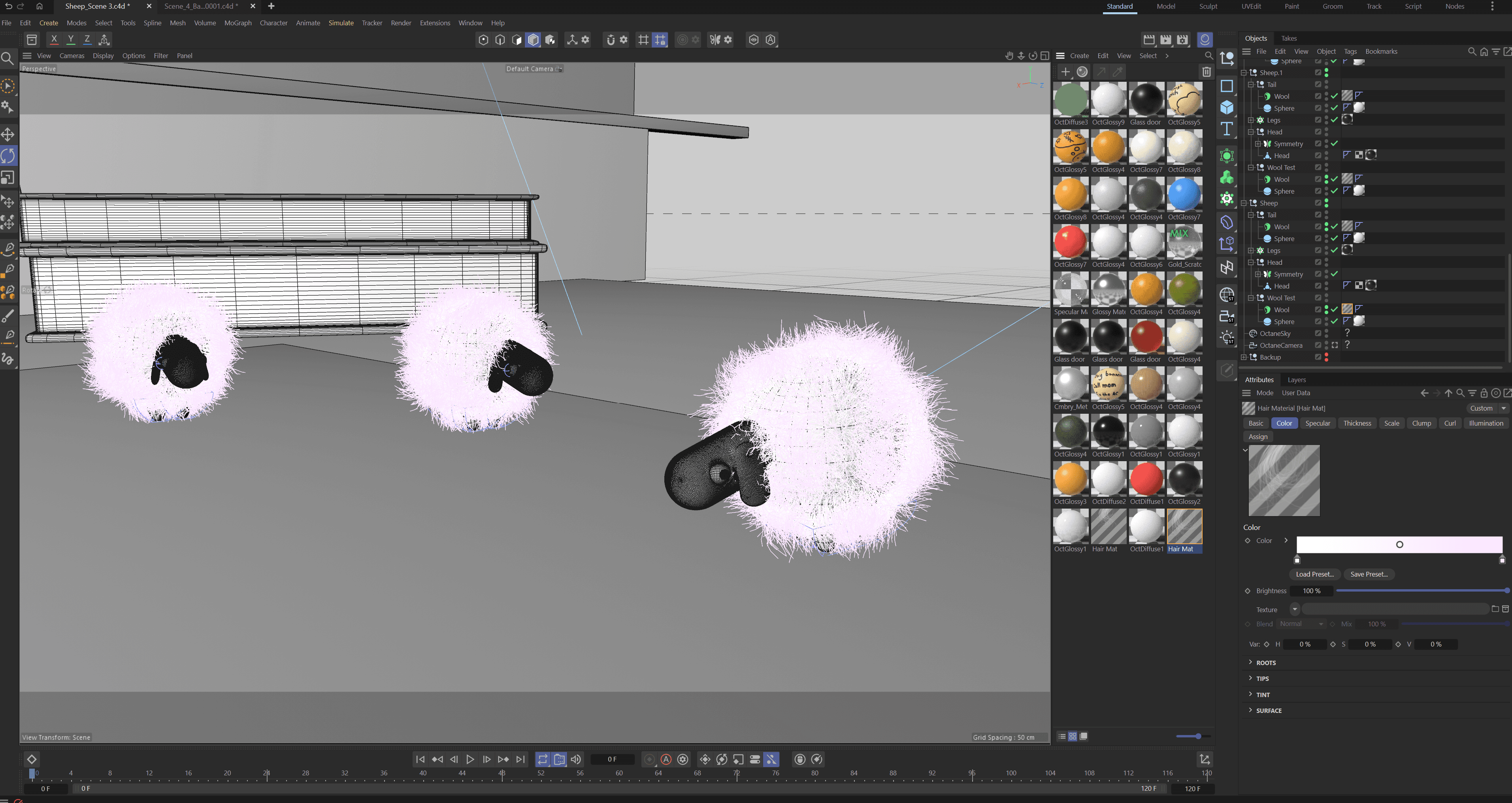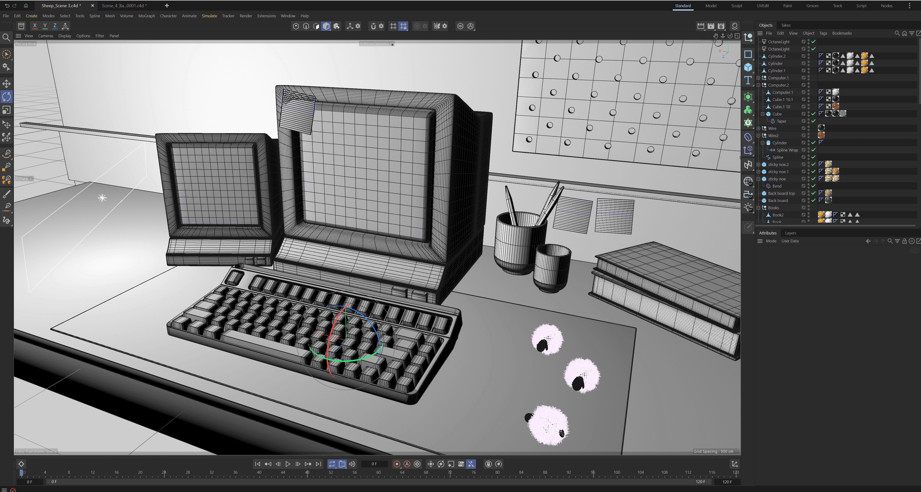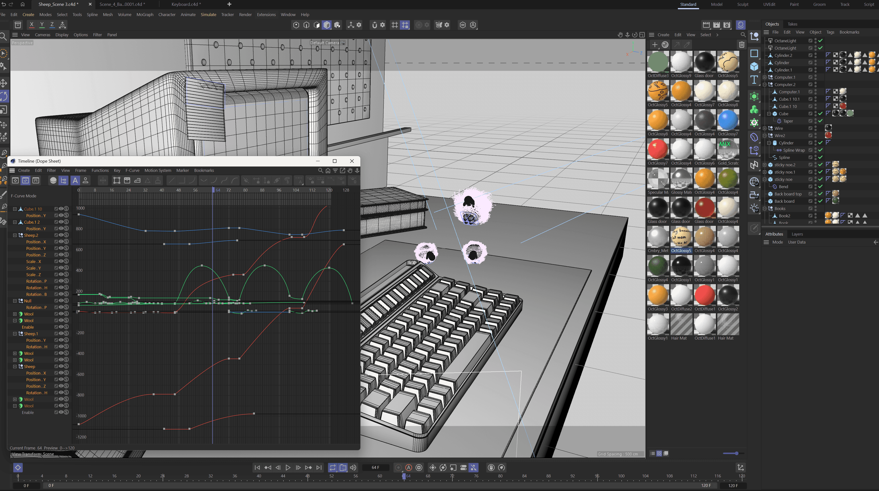 Due to the quick turnaround of the project, there was no time to storyboard or make an animatic. However, I would've been too excited to model these cute little sheep anyway and would've skipped right to them! So, I hopped straight into Cinema 4D and started modeling my box-shaped object, a keyboard. It was very challenging at first, but with the help of some peers (Sam Budish!) I was able to make a model with the correct topology. I then got to my favorite part, which was modeling the cute little sheep and attaching a hair simulation to their bodies.