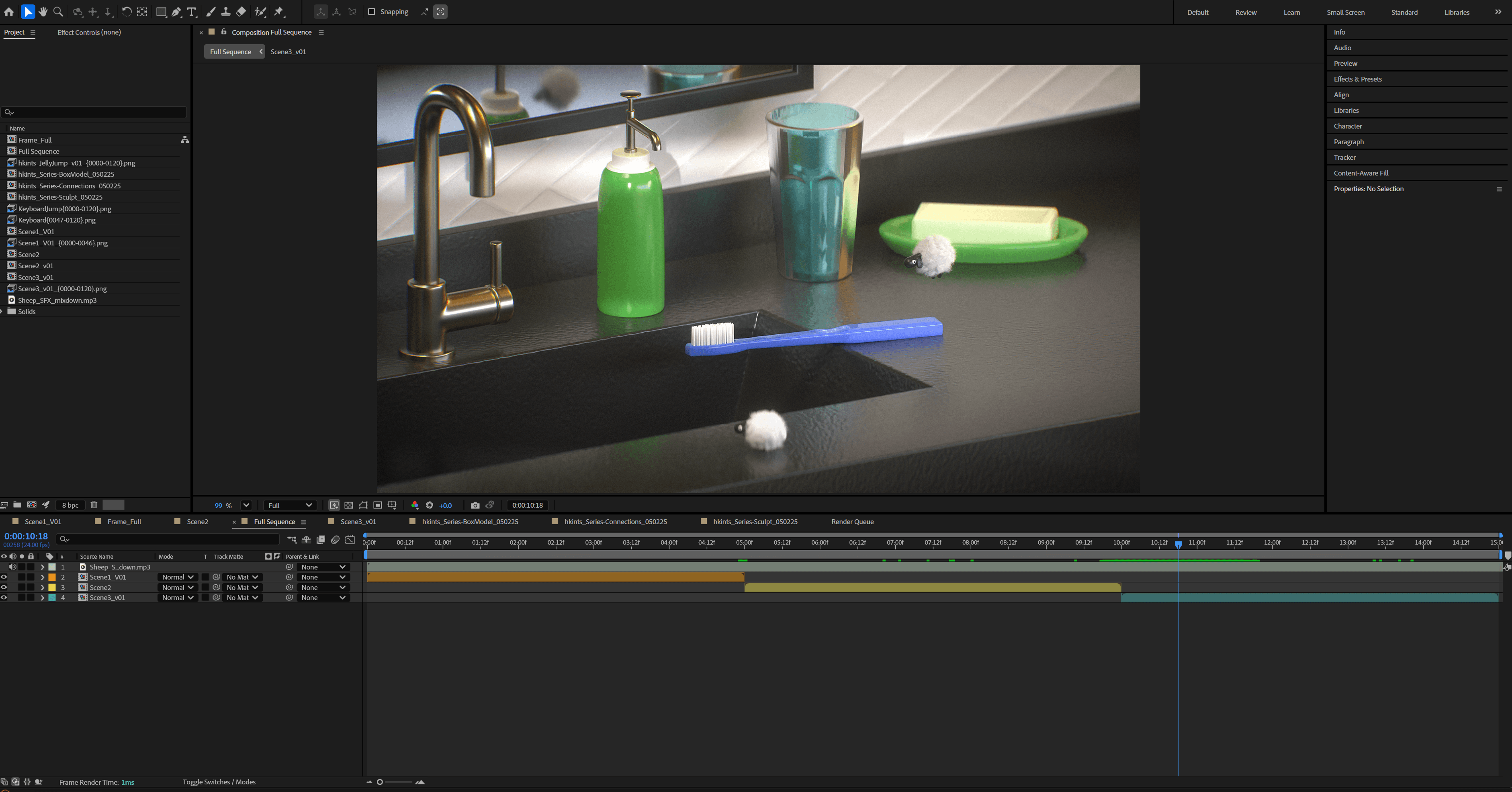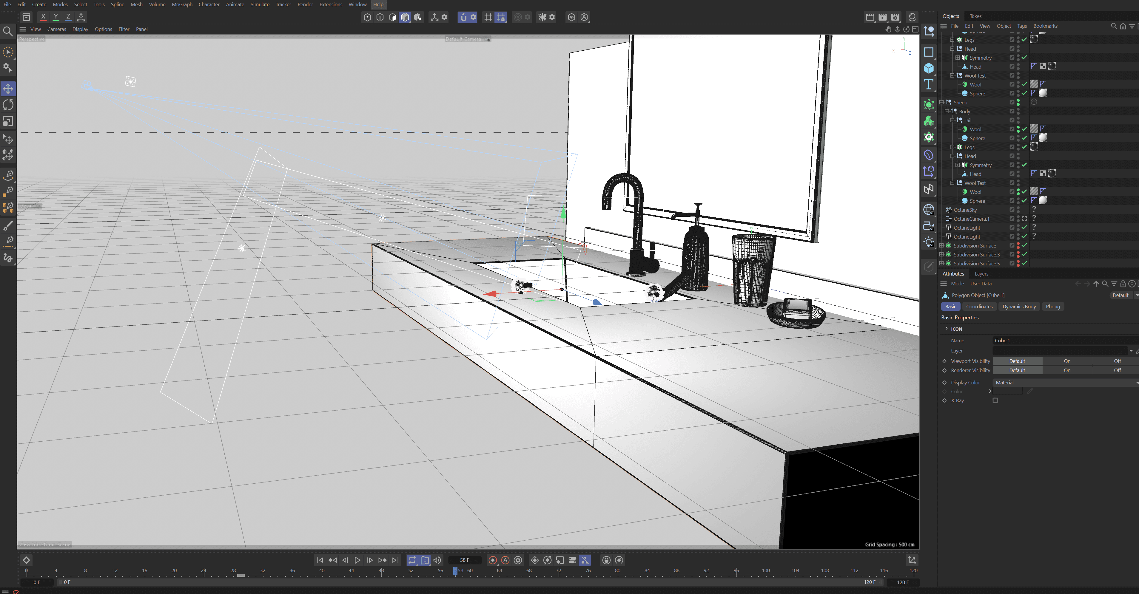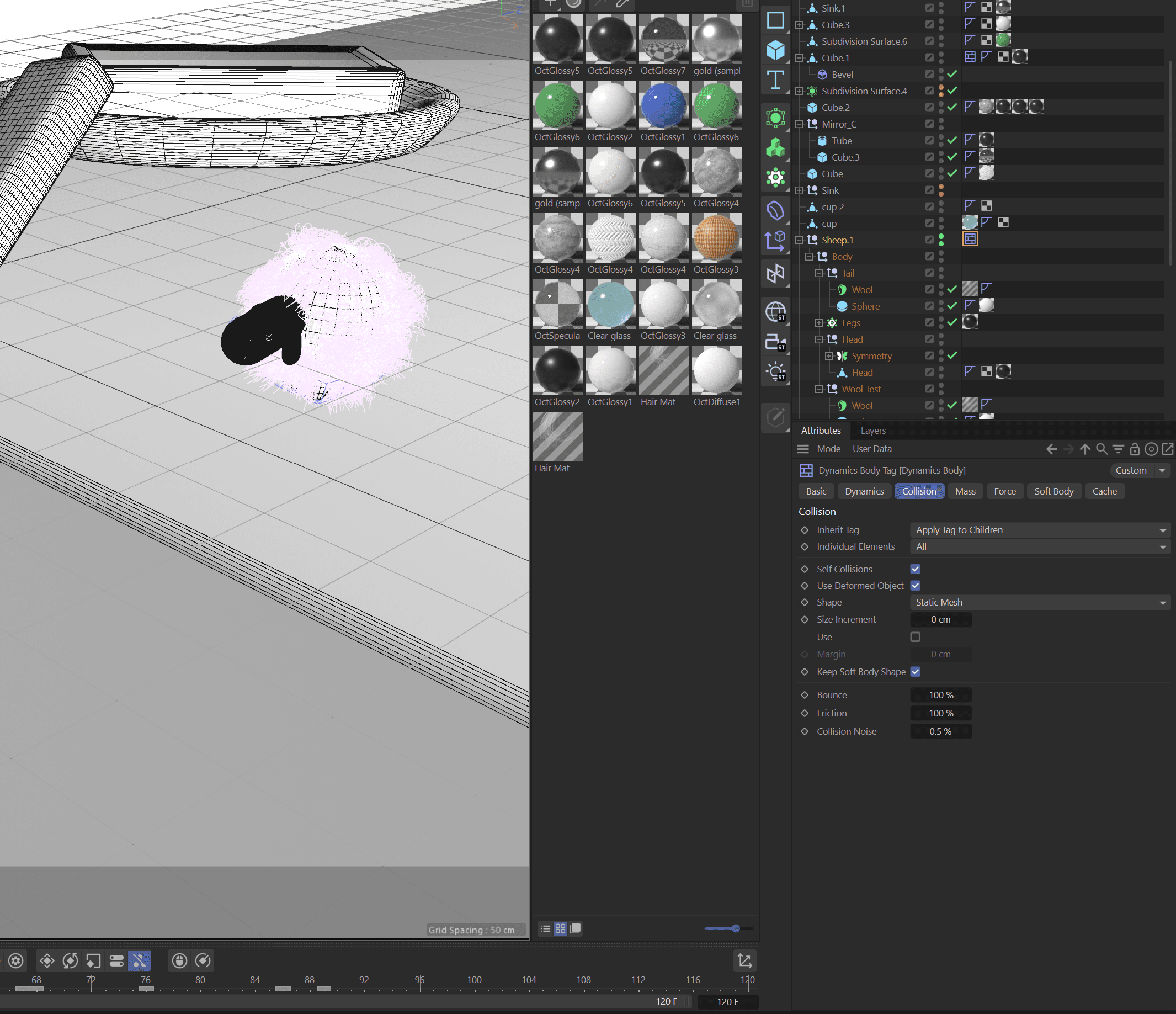 I then Carfully animated the sheep to interacte with the miiture world as if they were making a mess of someones orginized lifestyle. I also played with dynamic simulation withing Cinema 4D, Bakign in a colission physics simulation into the toothbrush that catapults that poor little sheep.